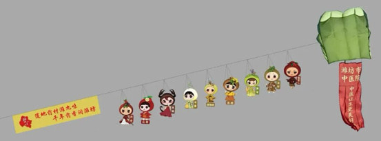 该风筝以潍坊传统非遗风筝为形,以潍坊道地药材“潍九味”为魂,将两者巧妙融合与创新,打造出独具辨识度的潍坊中医药文化新符号。呈串式结构,九只灵动单元依次相连,整体延展长达三十余米。每只单元风筝以一味道地中药材为主题,形象取自丹参、山楂、全蝎、半夏、密柴胡、连翘、黄芩、艾叶、酸枣仁,经艺术化提炼后,化作轻盈飘逸的药植精灵,迎风时起伏舒展,透出软体风筝的流动韵律。